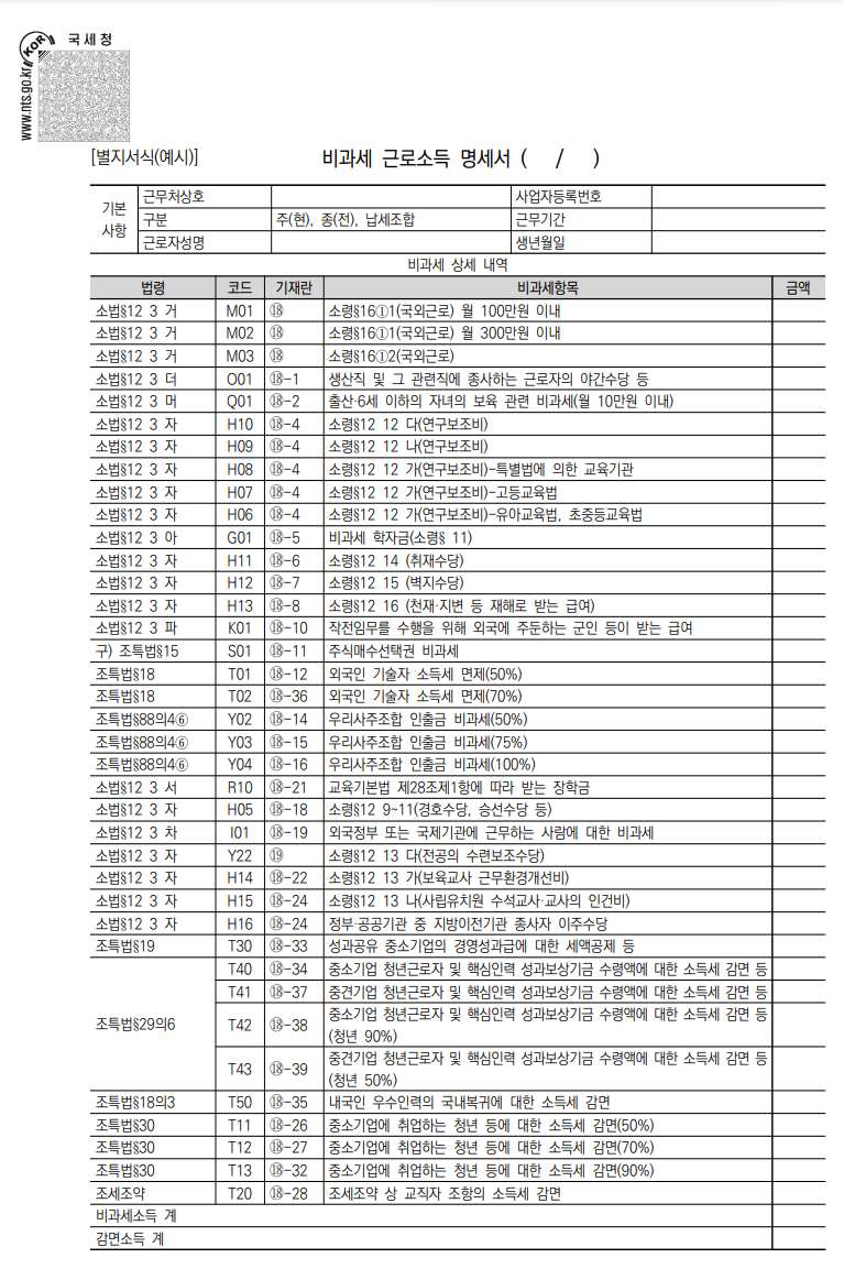● 주(현)근무지, 종(전)근무지별로 구분하여 기재하며, 지급명세서 작성대상 비과세소득을 해당 기재란에 해당 코드와 비과세금액을 기재